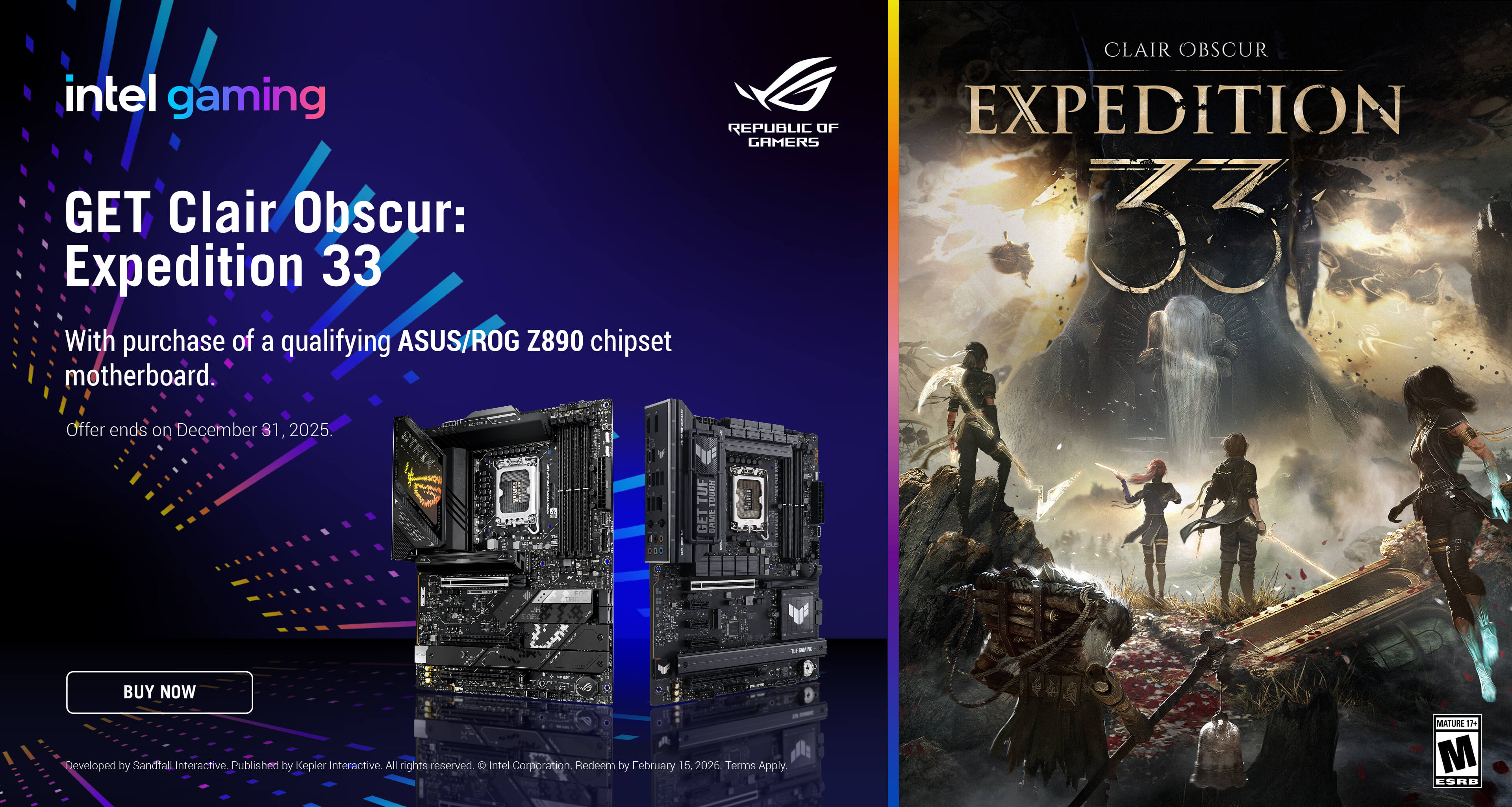 행사 사은품인 게임 번들은 “클레르 옵스퀴르: 33원정대”로 독특한 미학과 턴제 기반 실시간 전투 시스템을 결합한 작품이며, 예술적 감성과 전략적 플레이를 동시에 즐길 수 있는 게임으로 평가받고 있다. 해당 행사를 통해 ASUS의 인텔 코어 울트라 프로세서 전용 하이엔드 메인보드를 더욱 가성비 있게 구매할 수 있다.
