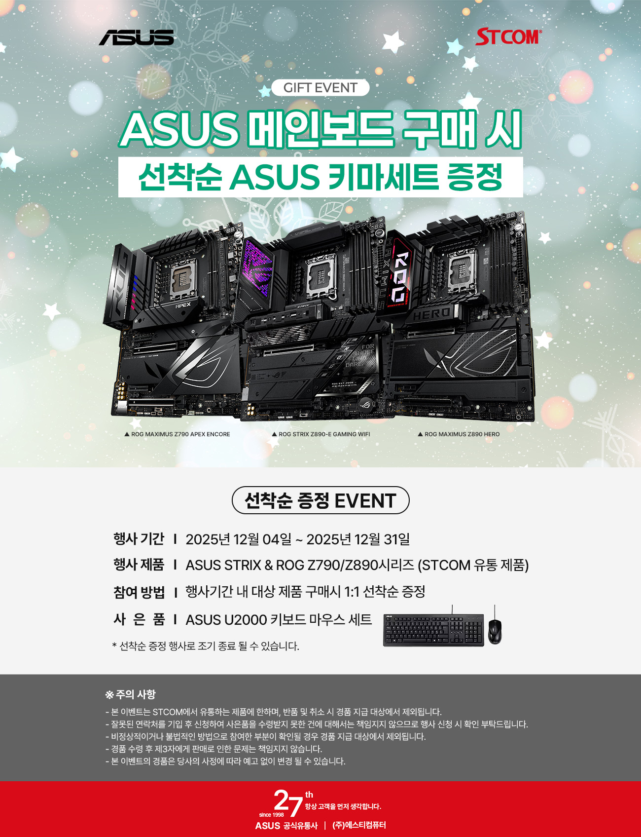행사 기간은 2025년 12월 4일부터 12월 31일까지 STCOM에서 유통하는 ASUS 행사 대상 제품을 구매하는 고객 중 선착순 100명에게 ASUS 키보드 & 마우스 세트를 증정한다. 판매처에 사은품 재고가 모두 소진될 시 행사가 조기에 종료될 수 있다.