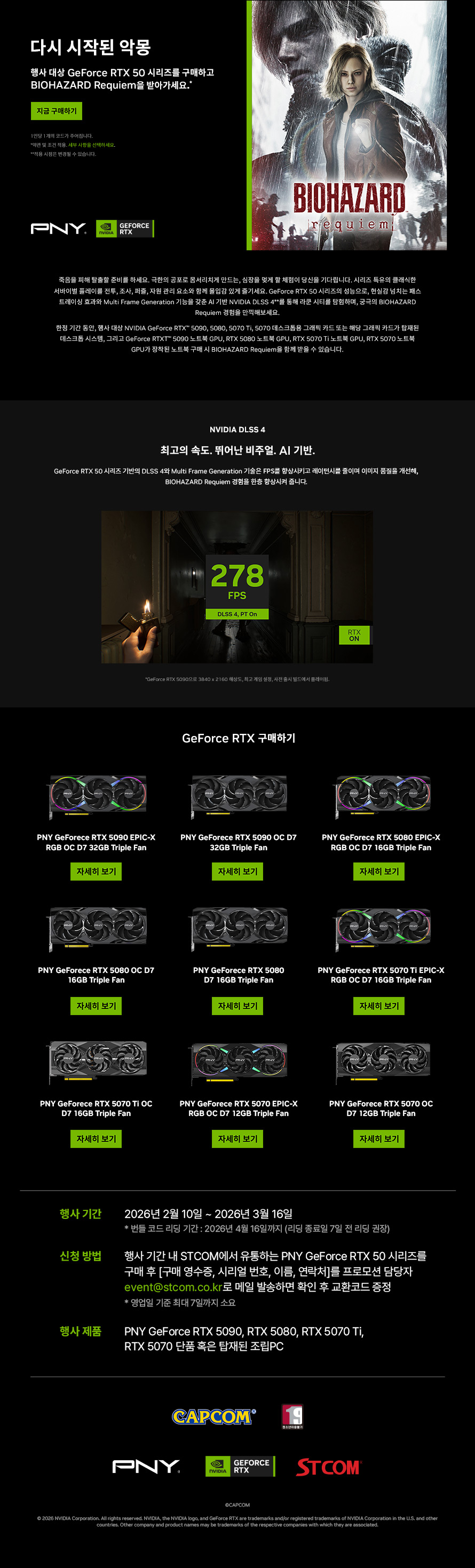 PC 컴포넌트 제조 분야에서 30년 이상의 경력으로 높은 평가를 받고 있는 PNY의 국내 유통사인 (주)에스티컴퓨터(이하, STCOM)는 PNY 지포스 RTX 50 시리즈 구매자를 대상으로 바이오하자드 신작 게임 번들 증정 행사를 진행한다.