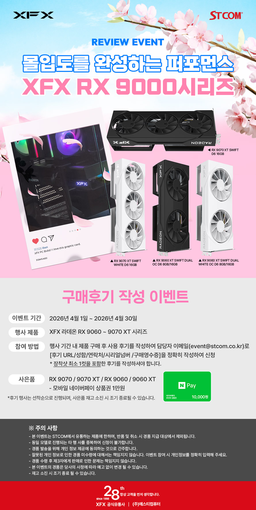 1998년 설립되어 20년 이상 컴퓨팅 관련 솔루션을 유통해온 전문 수입사인 (주)에스티컴퓨터 (대표: 서희문, 이하 STCOM)는 4월 XFX 라데온 RX 9000 시리즈 구매자를 대상으로 후기 작성 행사를 진행한다.