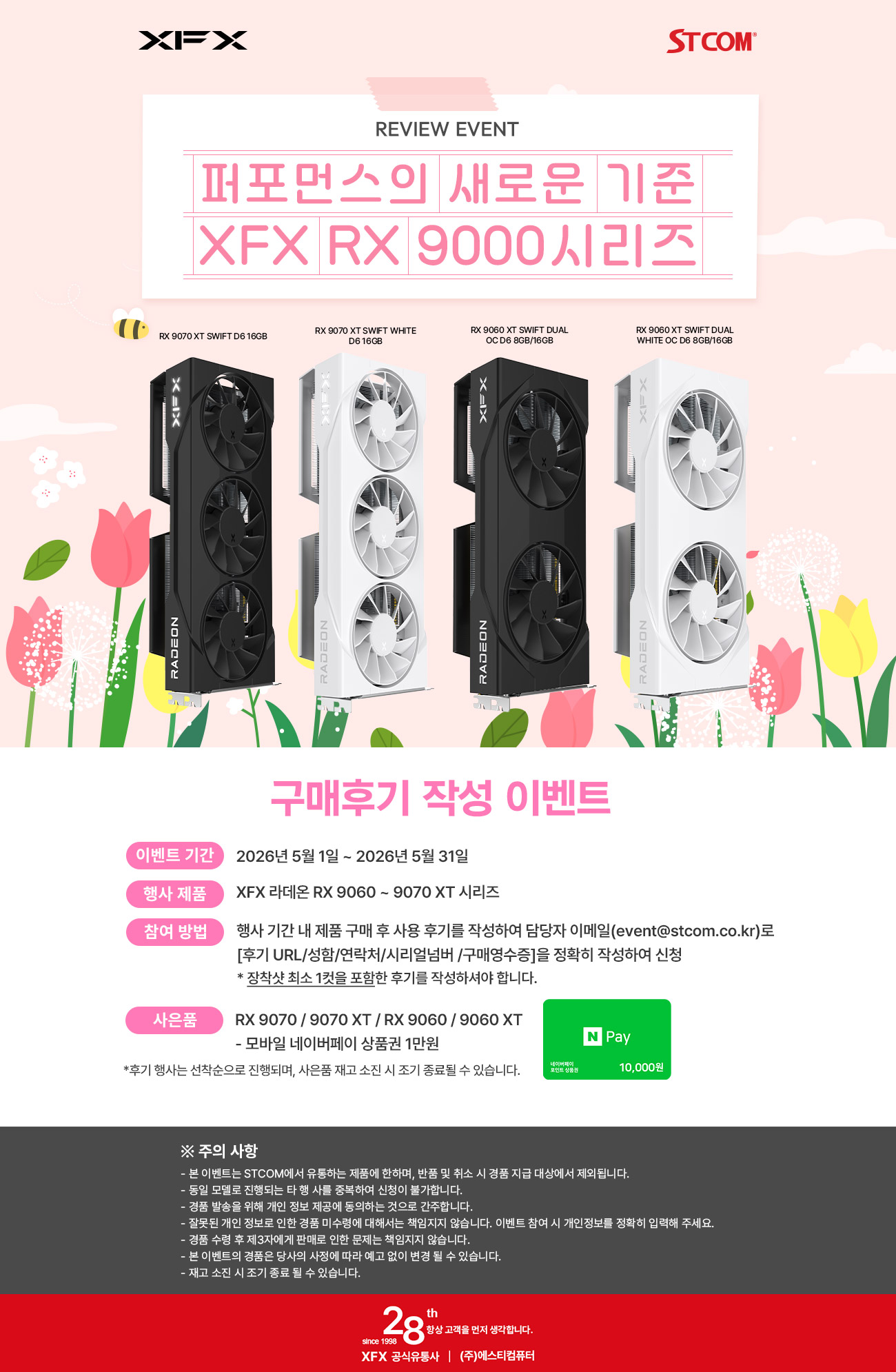 1998년 설립되어 20년 이상 컴퓨팅 관련 솔루션을 유통해온 전문 수입사인 (주)에스티컴퓨터 (대표: 서희문, 이하 STCOM)는 5월 XFX 라데온 RX 9000 시리즈 구매자를 대상으로 후기 작성 행사를 진행한다.